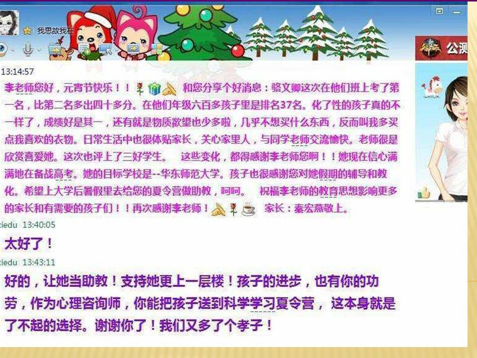 他现在信心满满的备战高考,他的目标学校是华东师范大学,孩子也很感谢你对她的辅导和教化,孩子假期里去给您的夏令营做助教。祝福李老师的教育思想影响更多的家长和有需要的孩子们,再次感谢李老师。家长秦宏燕敬上。
