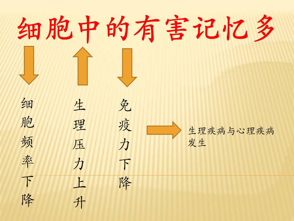 第一,细胞频率下降。我们浑身的细胞都有记忆,如果有害记忆多,我们的频率是下降的。有一种仪器叫做心率变异测试仪,可以检测细胞频率的高低。细胞频率高,说明有害记忆少,遗传基因好;那如果细胞频率低,说明你的遗传不好。如果有害记忆多,细胞频率就会下降,生理压力就会上升,生理压力是人得病的根源。