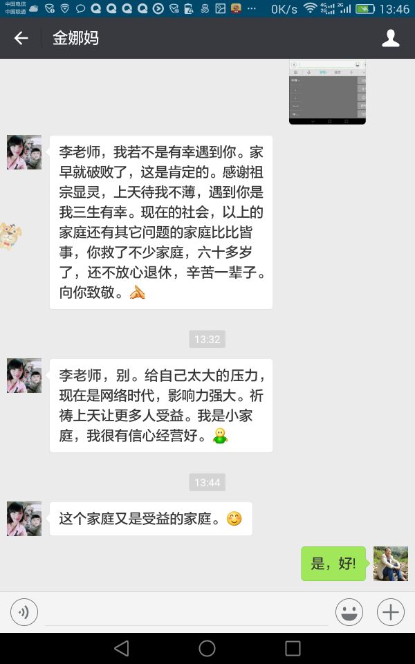 在对的季节,好的日子里,我心情愉悦地邂逅了“家和子贵”。此平台的化性课内容吸引了我们全家,激发了我们强烈的自信和求知欲望,于是我们一家四口在今年暑假参加了“科学教育法家和子贵”夏令营。李老师用他那智者的修为和大师的身教滋养着孩子们的心灵,开启了孩子的智慧之门。大孩子在夏令营中理解和掌握了圣人之言,清除了头脑中不健康的信念,使性、心、身三方面得到改善,三观端正,自身素质全面提高,使自己发生了蜕变。这不,孩子回到学校后,学习成绩如雨后春笋,步步高升。小孩子也变得乖巧可爱。原本分离的家庭从此合和了,过上了其乐融融的日子。